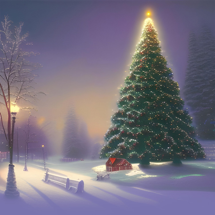 A breathtaking winter wonderland scene featuring a glowing Christmas tree surrounded by peaceful snow, twinkling lights, and a dreamy purple sunset. This background adds warmth and serenity to your holiday emails, creating a timeless and heartwarming atmosphere.