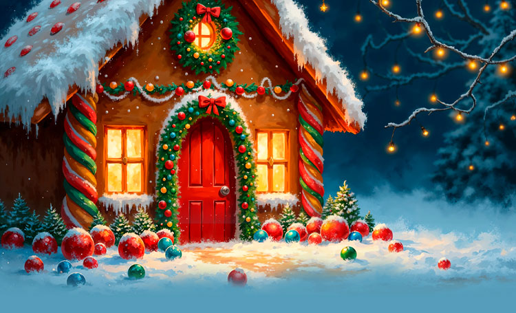 Step into a magical winter night with this festive email background featuring a glowing gingerbread house surrounded by colorful ornaments and soft falling snow. Perfect for spreading sweet holiday cheer.
