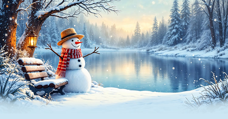 Celebrate the season with this heartwarming winter scene featuring a cheerful snowman beside a snowy bench, overlooking a tranquil frozen lake at sunset. Perfect for spreading holiday cheer in your email messages with a calm, festive ambiance.