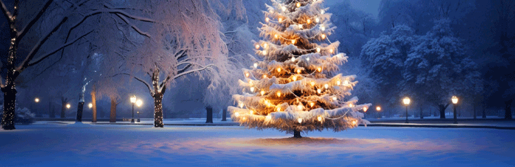 A stunning Christmas tree glows under a starry sky, surrounded by snow-covered trees and soft golden lights. This magical winter scene brings elegance and holiday cheer to your messages, making every email feel warm and festive.