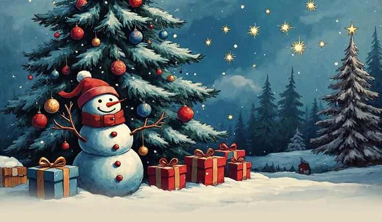 Celebrate the season with this heartwarming email background featuring a cheerful snowman, twinkling stars, and a beautifully decorated Christmas tree surrounded by gifts. Perfect for spreading festive joy in every message you send.