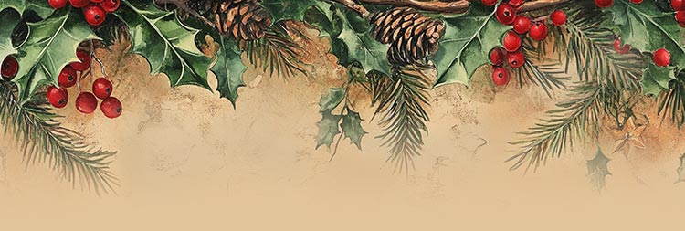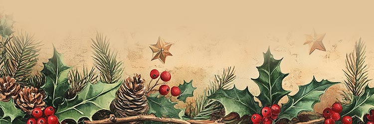 A classic Christmas-themed email background featuring watercolor holly leaves, pinecones, and vibrant red berries set on a warm parchment backdrop. Perfect for heartfelt holiday messages or seasonal greetings that need a touch of tradition and warmth. Designed to scale beautifully in Gmail, Outlook, and Apple Mail.