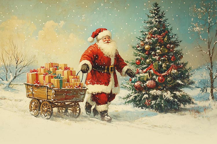 Add joy to your emails with this warm and whimsical image of Santa pulling a wagon full of colorful presents through the snow. A nostalgic touch for your Christmas messages.