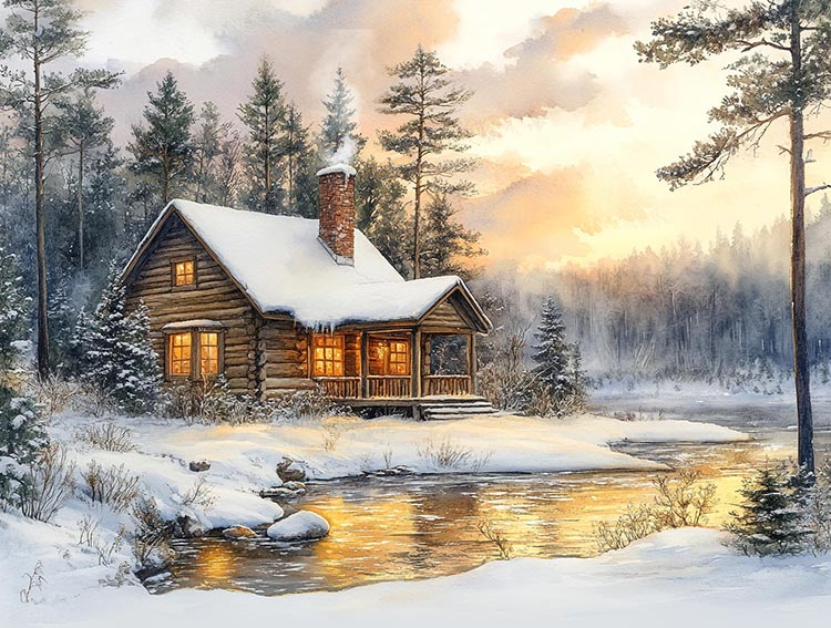 A peaceful log cabin glows warmly beside a quiet snow-covered river, framed by frosted trees and a golden winter sky. This serene email background captures the cozy beauty of a rustic holiday season.