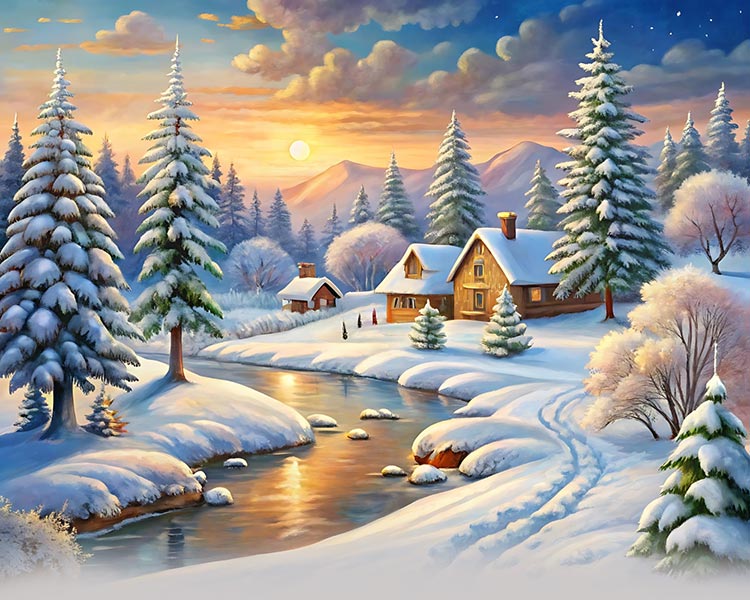 A peaceful snowy village at sunset, featuring cozy cabins, pine trees dusted with snow, and a softly flowing stream reflecting warm golden light. This background creates a calm, elegant winter atmosphere—perfect for holiday greetings, seasonal announcements, or heartfelt winter messages.