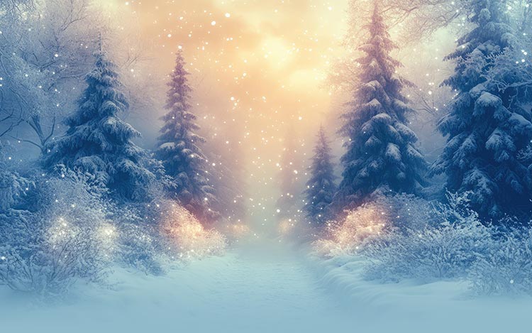 A serene snow-covered forest illuminated by soft golden light and gently falling snowflakes. The glowing pathway draws the eye forward, creating a peaceful and elegant backdrop ideal for winter greetings, holiday messages, or reflective seasonal announcements.