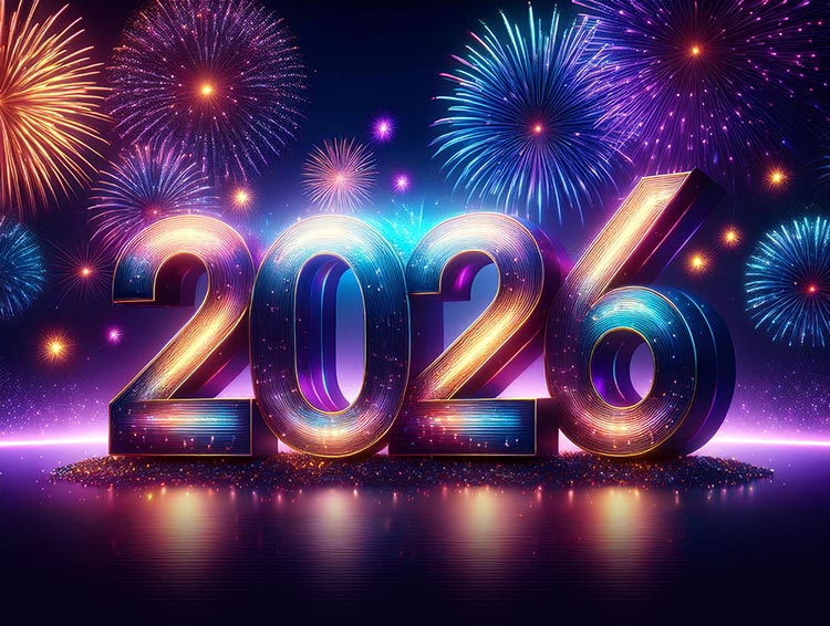 A bold and vibrant New Year scene showcasing glowing “2026” numerals surrounded by colorful fireworks and radiant light effects. This background delivers energy, excitement, and celebration—perfect for New Year announcements, festive greetings, and kickoff messages for the year ahead.