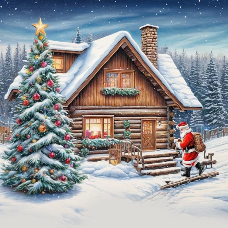 A heartwarming winter scene featuring Santa arriving at a snow-covered log cabin beside a beautifully decorated Christmas tree glowing with warm lights. This background captures the magic, warmth, and nostalgia of Christmas—perfect for holiday greetings, family messages, and festive announcements.