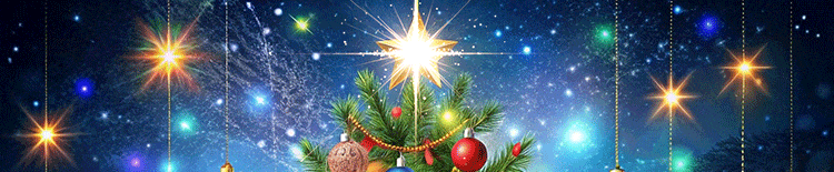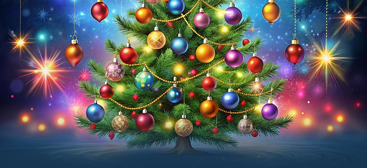 A dazzling Christmas tree adorned with colorful ornaments, golden garlands, and a glowing star topper, set against a magical night sky filled with twinkling lights. This festive background brings joy, warmth, and holiday sparkle—perfect for Christmas greetings, seasonal announcements, and celebratory emails.
