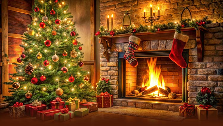 A warm and inviting holiday scene featuring a glowing fireplace, a beautifully decorated Christmas tree, and festive stockings hung with care. This background captures the comfort and joy of Christmas at home—perfect for heartfelt greetings, family messages, and seasonal celebrations.