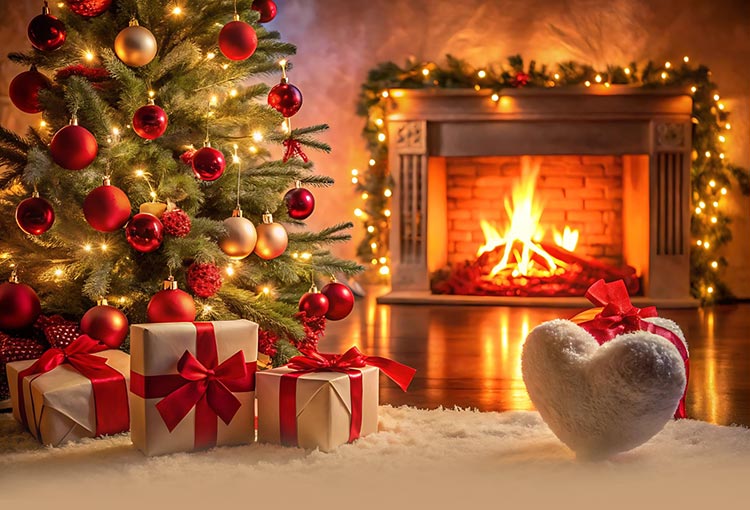 A cozy holiday scene featuring a beautifully decorated Christmas tree, glowing fireplace, and wrapped gifts with festive red ribbons. The soft candlelight and warm tones create a heartfelt atmosphere—perfect for Christmas greetings, love-filled messages, and joyful seasonal announcements.