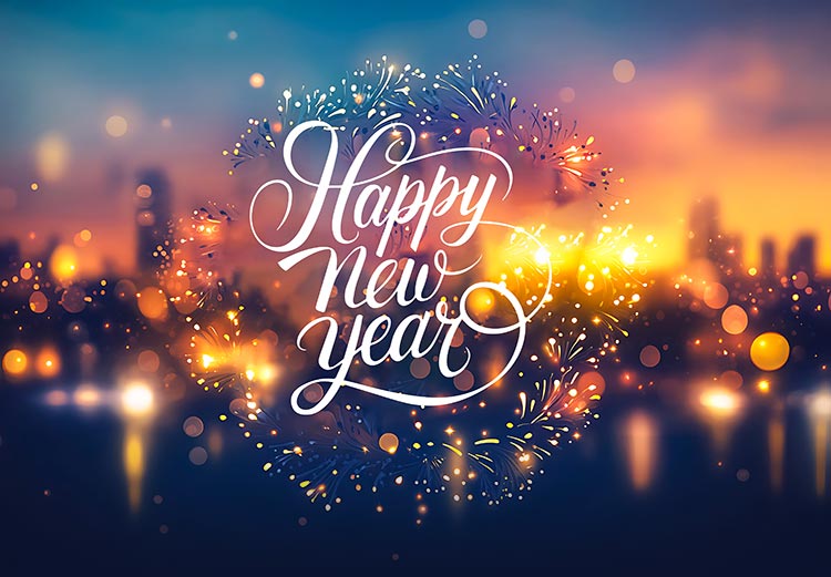 A vibrant New Year scene featuring elegant “Happy New Year” lettering surrounded by glowing fireworks and golden bokeh lights over a softly blurred city skyline. This background captures celebration, optimism, and fresh beginnings—perfect for New Year greetings, announcements, and festive messages.